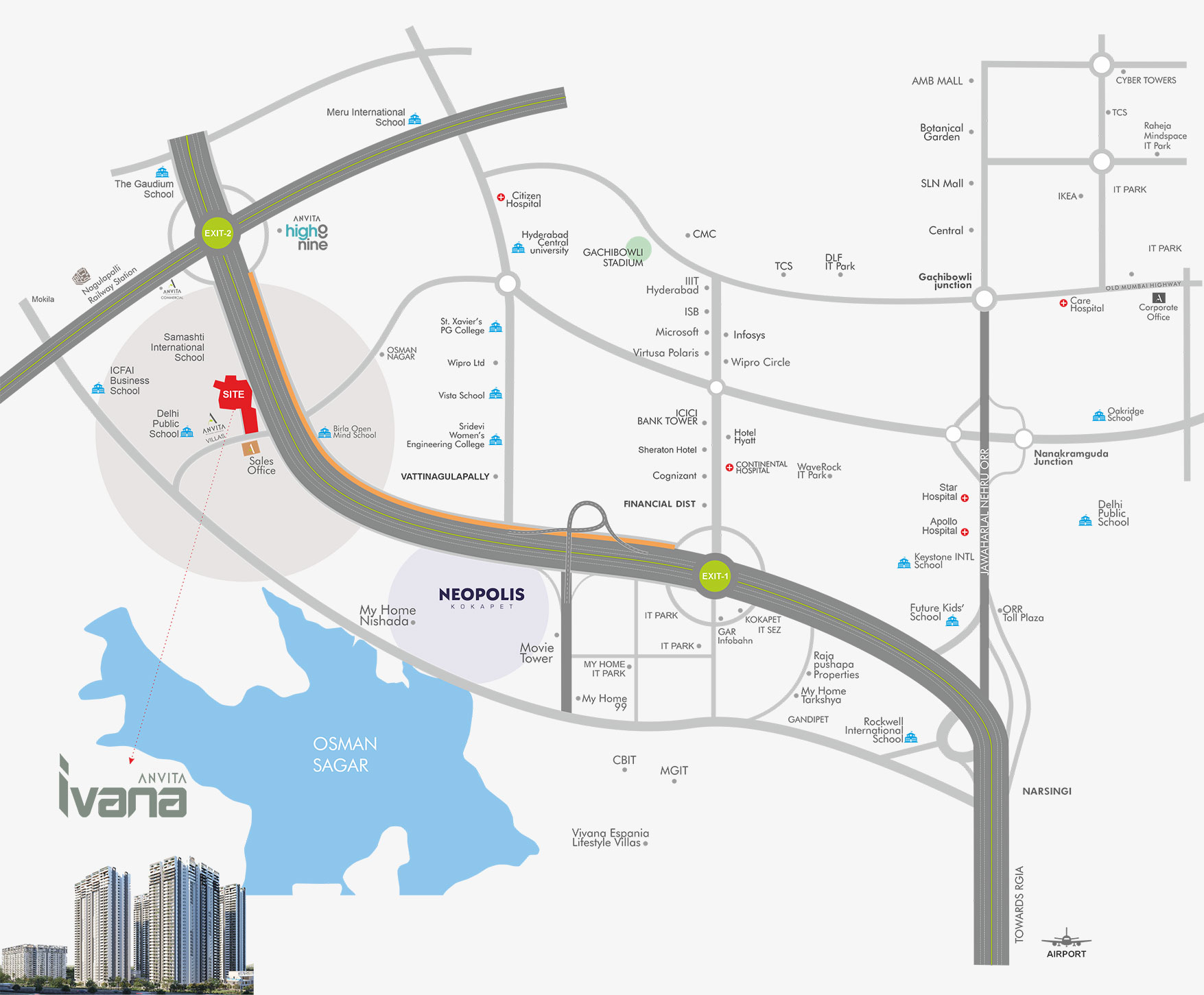 Situated in Kokapet, one of Hyderabad’s most sought-after locations, Godrej Gated Apartments bring you close to the best of the city. Experience seamless connectivity with major IT hubs, educational institutions, shopping centers, and cultural landmarks just minutes away.